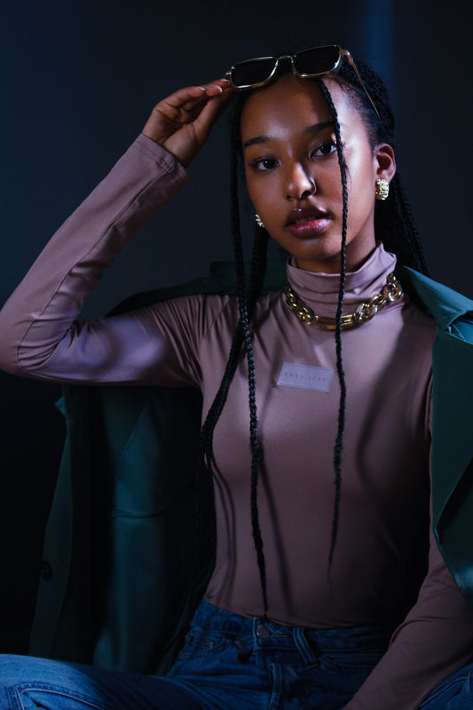 Experience the perfect blend of style and comfort with our Turtleneck Bodysuit. It comes in a luxurious pale pink color, adorned with the iconic EMMA JEAN logo